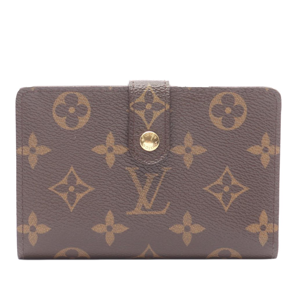 The Porte Monnaie Billets Viennois features a monogram canvas body, a strap with a snap button closure, a back compartment with a kiss lock closure, and interior slip pockets.