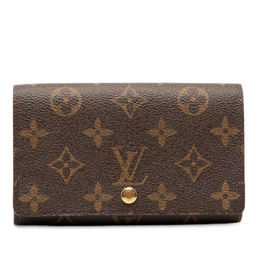 This wallet features a monogram canvas body, a front flap with button clasp closure, and interior zip and slip compartments.