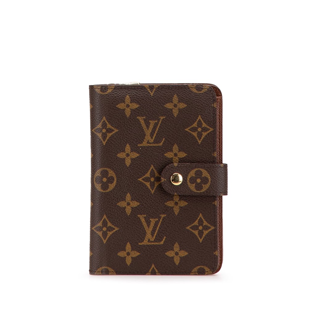 This small wallet features a monogram canvas body, a strap with snap button closure, an interior zip compartment, and interior slip pockets.