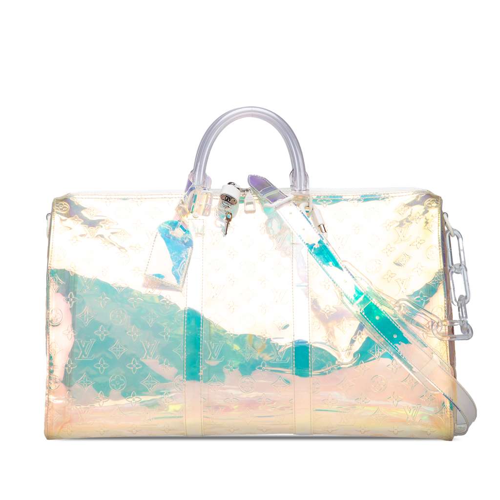 The Prism Keepall Bandouliere 50 features a PVC body, rolled top handles, a detachable and adjustable flat shoulder strap, and a top zip closure.