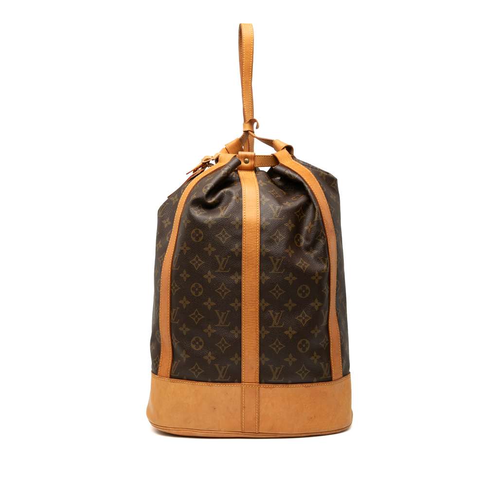 The Randonnee GM features a monogram canvas body with vachetta leather trim, a flat vachetta leather strap, a top drawstring closure, and an interior zip pocket.