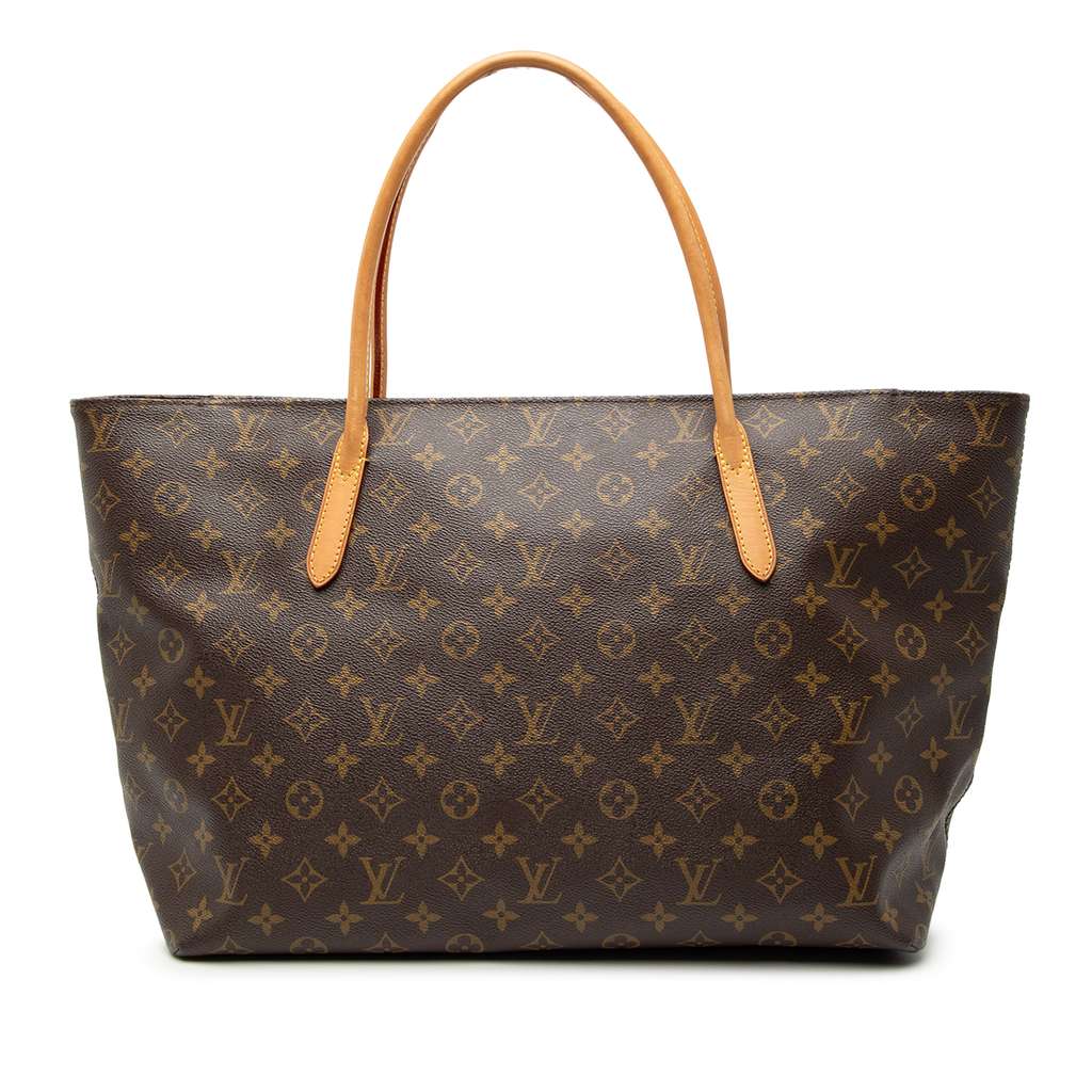 The Raspail MM features a monogram canvas body, rolled vachetta leather handles, a top zip closure, and interior zip and slip pockets.