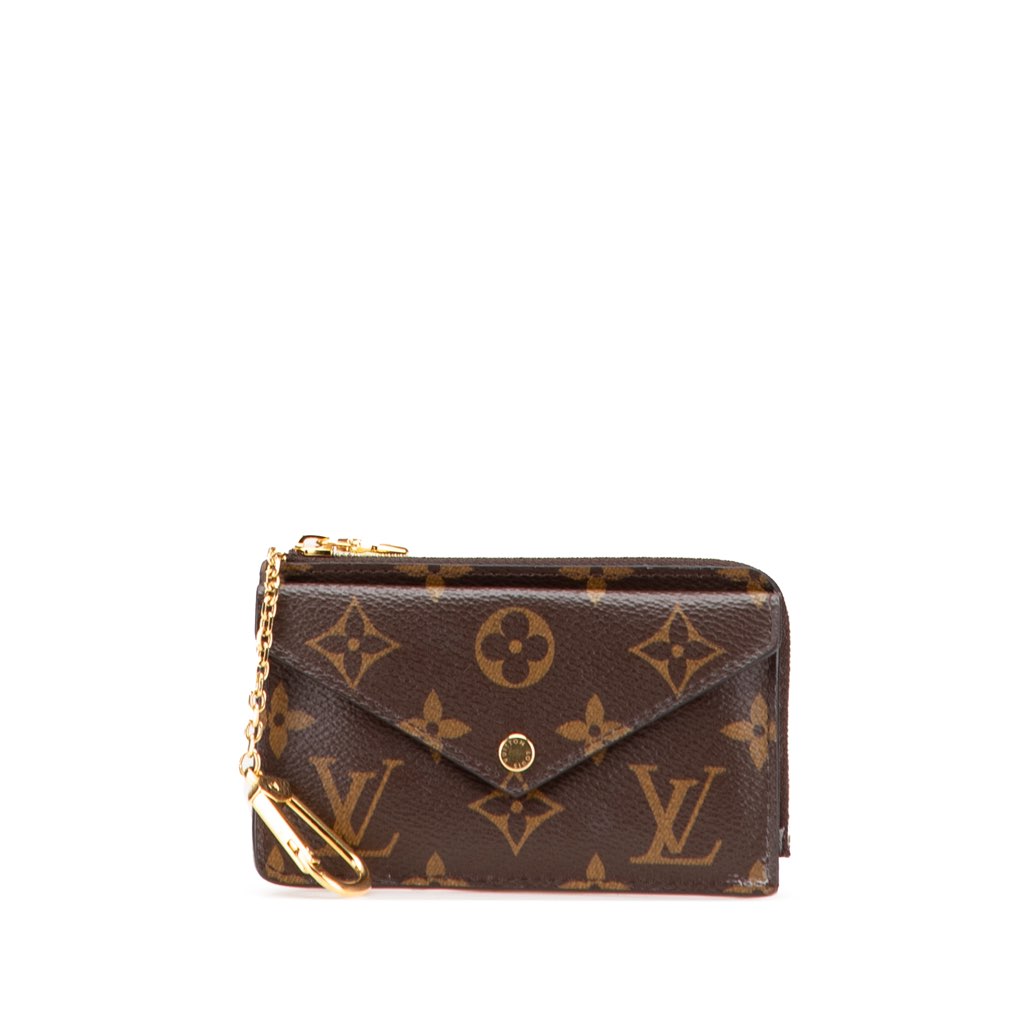 This card holder features a monogram canvas body with leather trim, a top zip closure, a front flap with a snap button closure, and exterior back card slots.