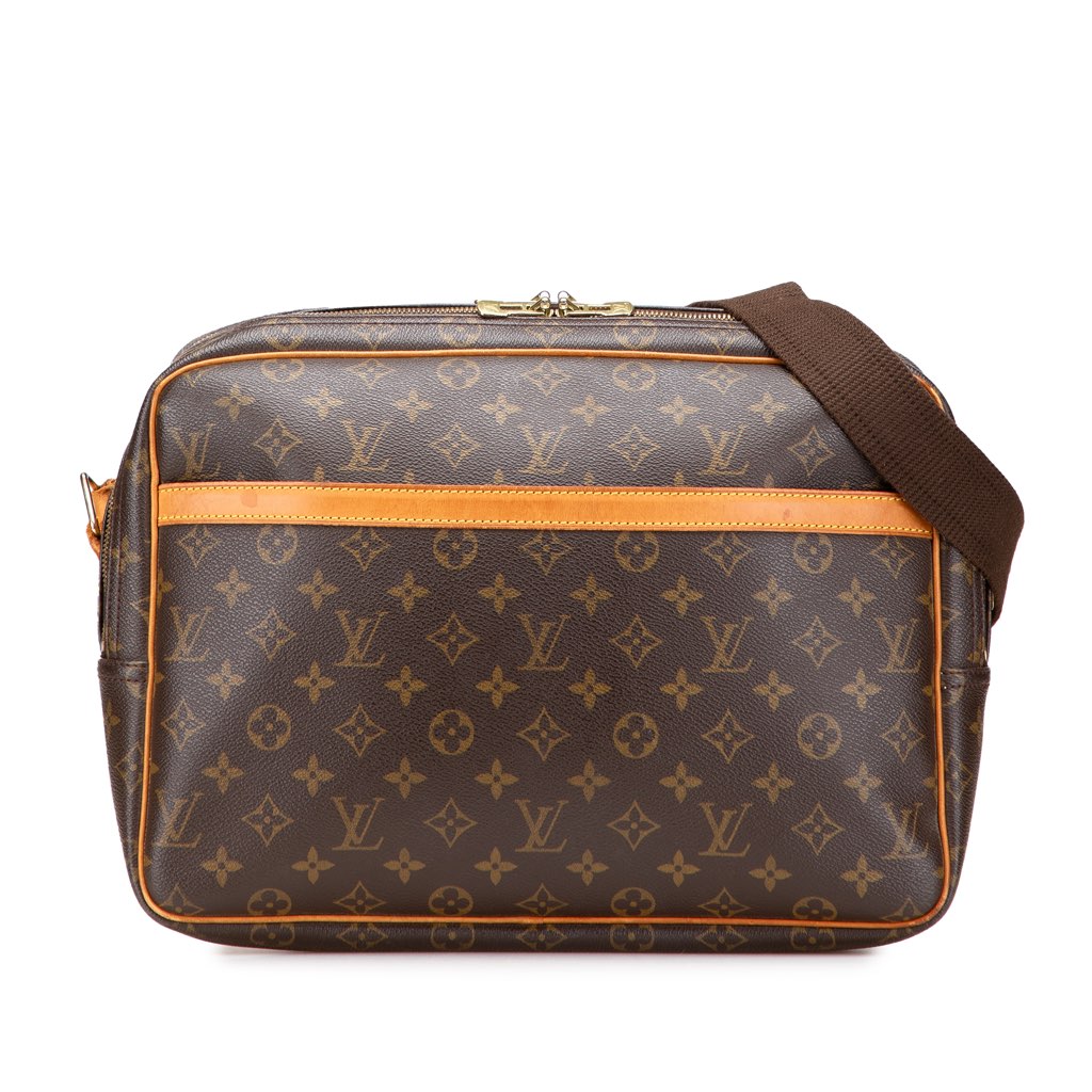 The Reporter GM features a monogram canvas body with vachetta leather trim, an adjustable flat canvas strap, double compartments with top zip closures, an exterior front slip pocket, and interior slip pockets.