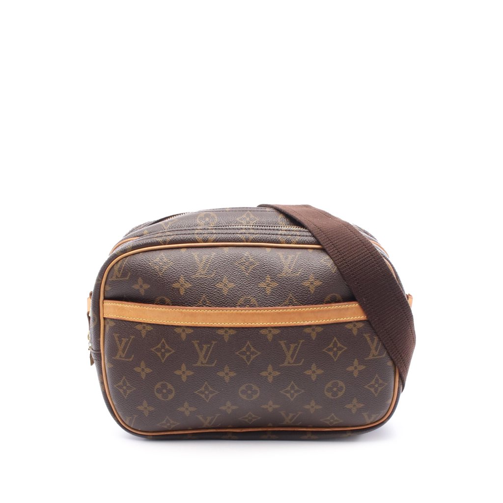 The Reporter PM features a monogram canvas body with leather trim, a front exterior slip pocket, an adjustable flat strap, double compartments with top zip closures, and interior slip pockets.