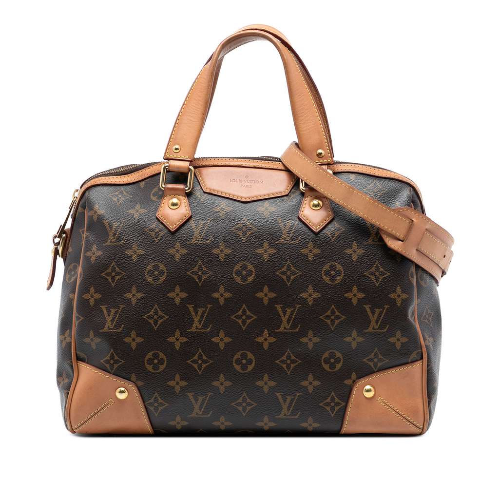 The Retiro PM features a monogram canvas body with vachetta leather trim, flat vachetta leather handles, a detachable flat vachetta strap, a top zip closure, and interior zip and slip pockets.