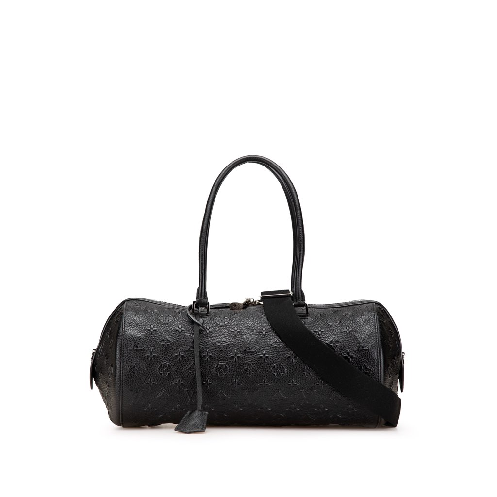 The Neo Papillon GM features a monogram revelation leather body, rolled leather handles, a detachable and adjustable canvas shoulder strap, a top zip closure, and interior zip and slip pockets.