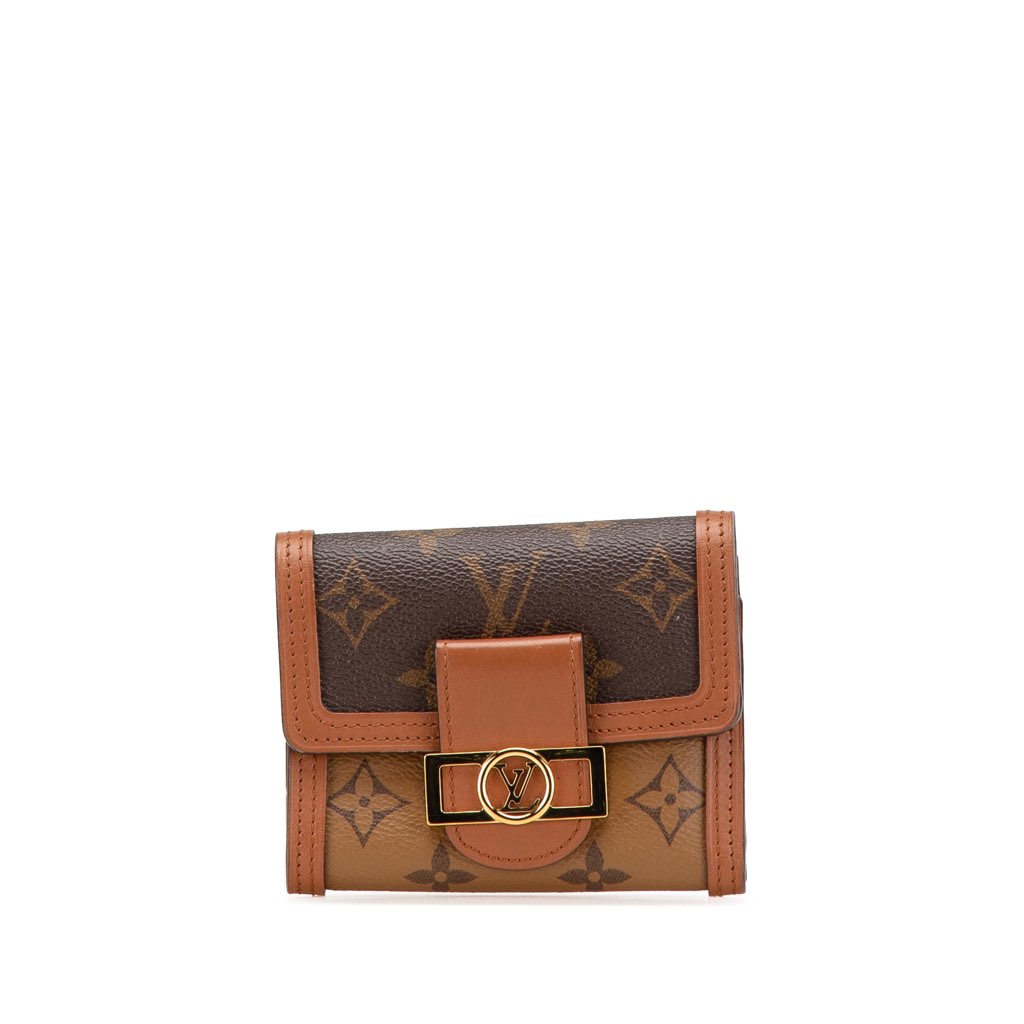 The Dauphine Compact Wallet features a monogram reverse canvas body with leather trim, a front flap with magnetic snap closure, and interior zip and slip pockets.