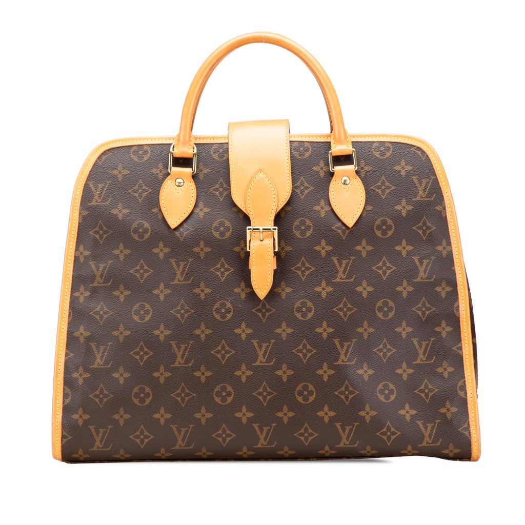 The Rivoli Business bag features a monogram canvas body with vachetta leather trim, rolled vachetta leather handles, flat strap with buckle detail, top zip closure, exterior open pockets, and interior zip and slip pockets.