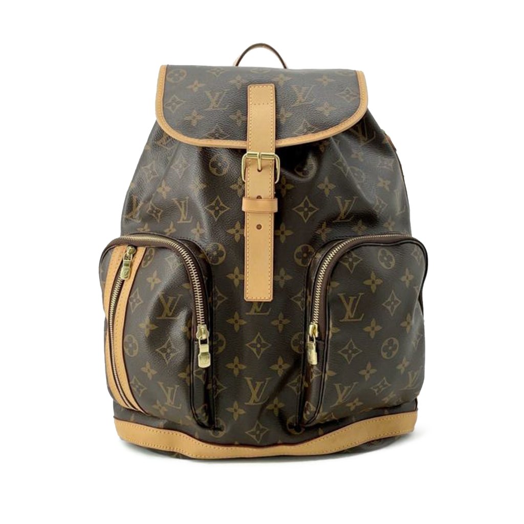 The Sac a Dos Bosphore backpack features a monogram canvas body with vachetta leather trim, flat back straps, a flat top handle, a top flap with buckle and drawstring closures, and exterior front zip pockets.