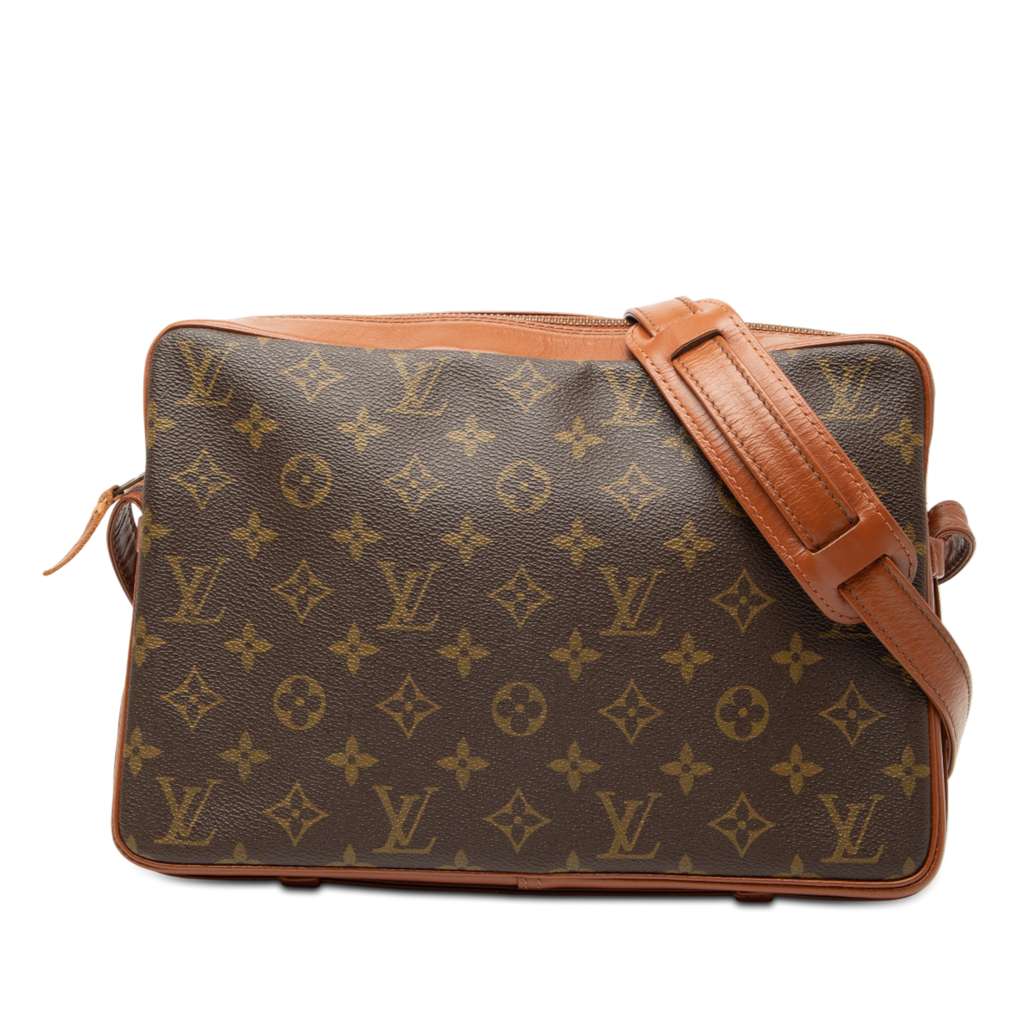 The Sac Bandouliere features a monogram canvas body, a flat leather strap, a top zip closure, and interior zip and slip pockets.