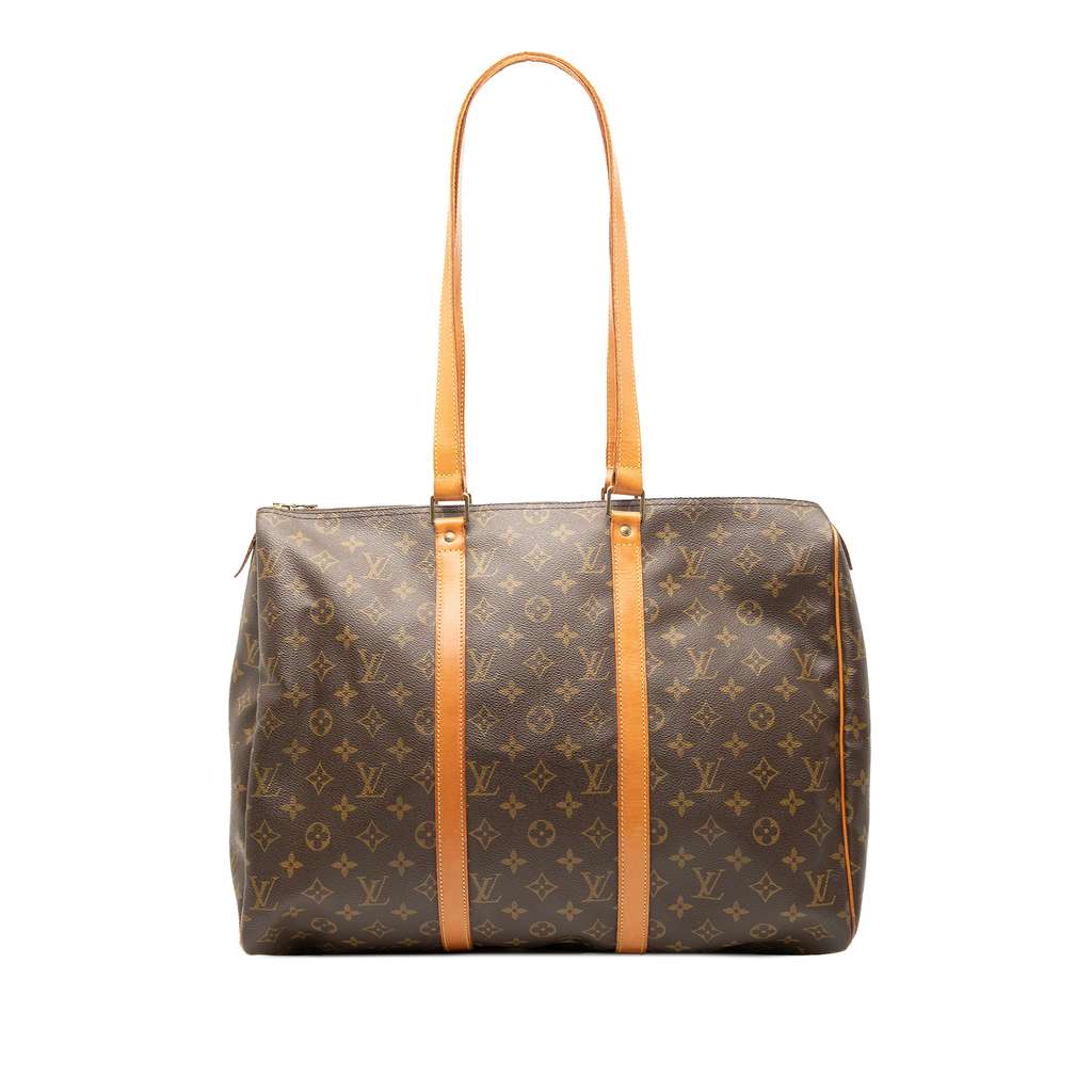 The Sac Flanerie 45 features a monogram canvas body with vachetta leather trim, flat vachetta shoulder straps, a top zip closure, and an interior slip pocket.