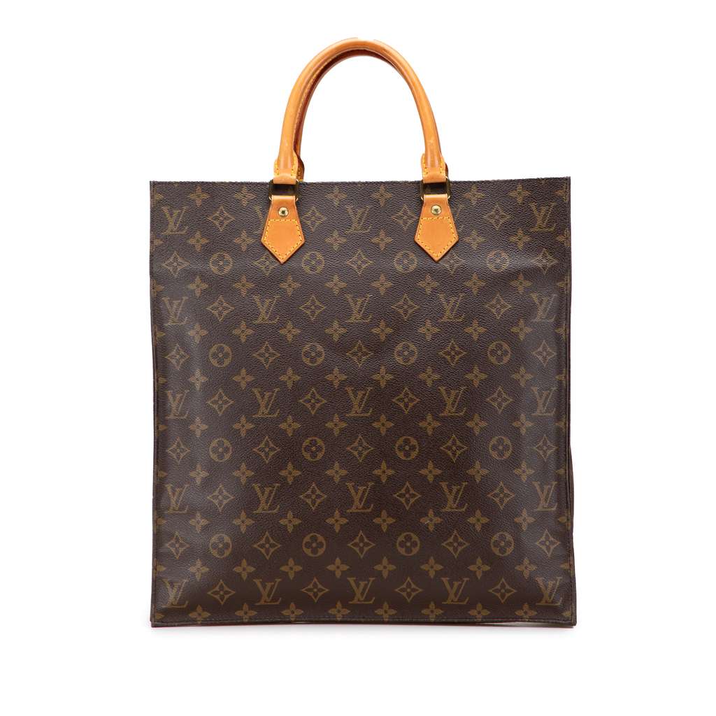 The Sac Plat features a monogram canvas body, rolled vachetta leather handles, an open top, and interior slip pockets.