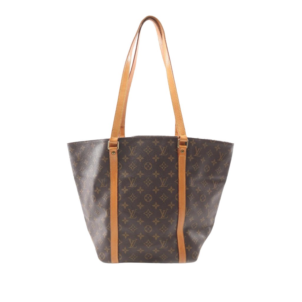 The Sac Shopping features a monogram canvas body with vachetta leather trim, flat vachetta leather shoulder straps, an open top, and an interior zip pocket.