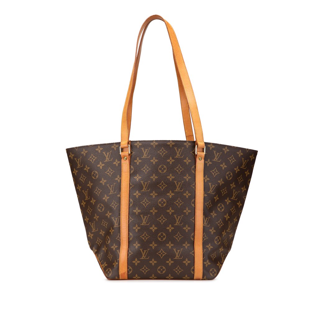 The Sac Shopping features a monogram canvas body with vachetta leather trim, flat vachetta leather shoulder straps, an open top, and an interior zip pocket.