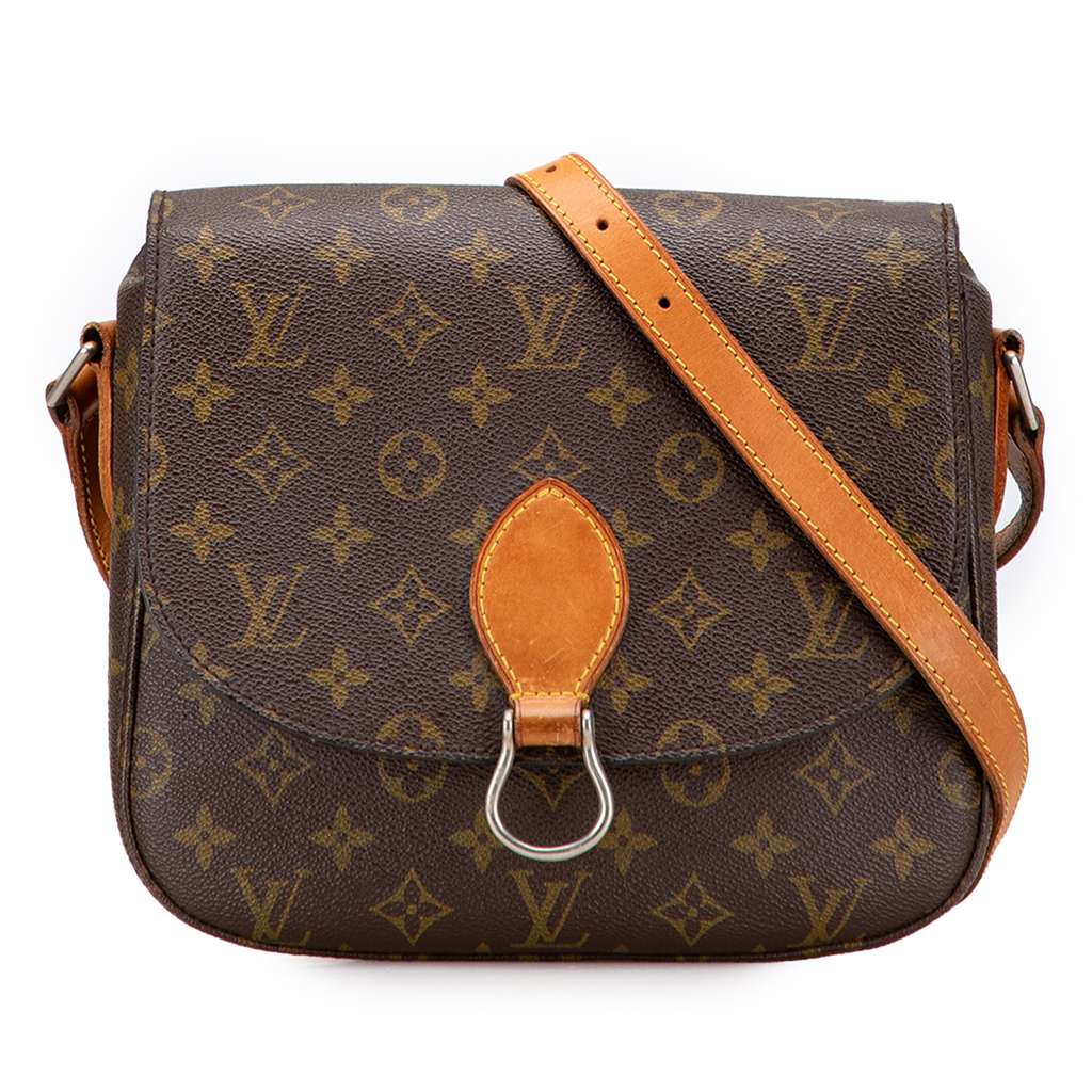 The Saint Cloud features a monogram canvas body, a flat vachetta leather strap, a front flap with magnetic snap closure, an exterior back slip pocket, and an interior zip pocket.