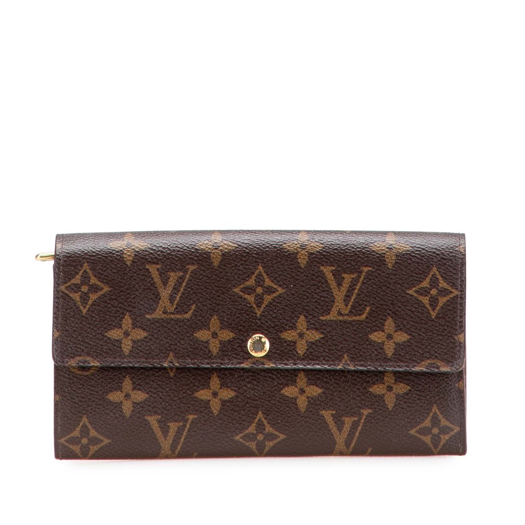 This wallet features a monogram canvas body, a flap with a snap button closure, and interior zip and slip compartments.
