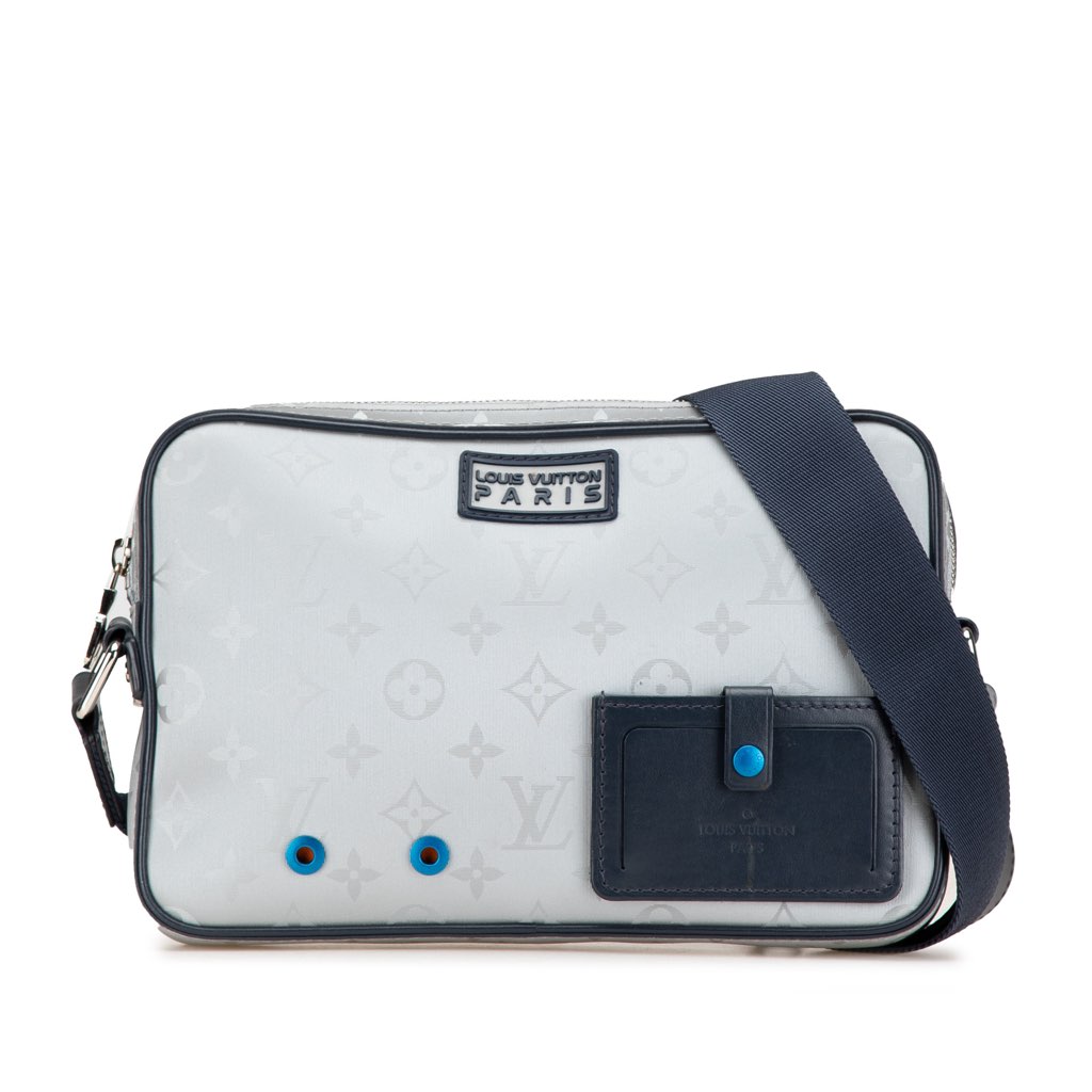 The Satellite Alpha Messenger features a monogram canvas body, an adjustable flat shoulder strap, a top zip closure, exterior pockets, and interior slip pockets.