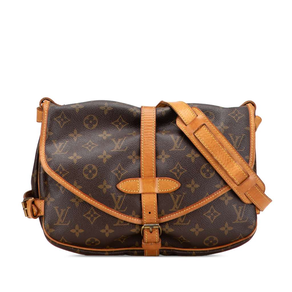 The Saumur 25 features a monogram canvas body with vachetta leather trim, an adjustable flat vachetta leather shoulder strap, double open compartments with front flaps and belt buckle closures.