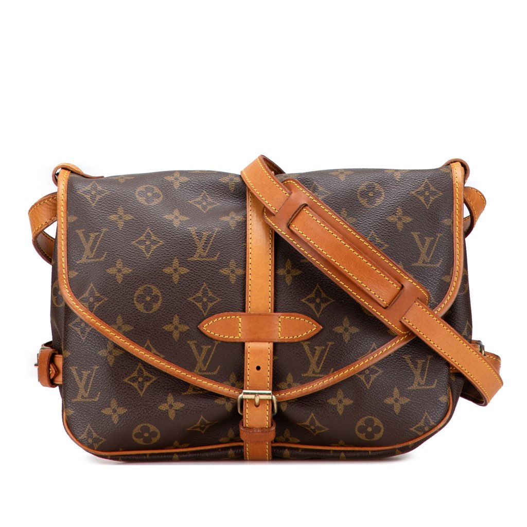 The Saumur 30 features a monogram canvas body with vachetta leather trim, an adjustable flat vachetta leather shoulder strap, double open compartments with front flaps and belt buckle closures.