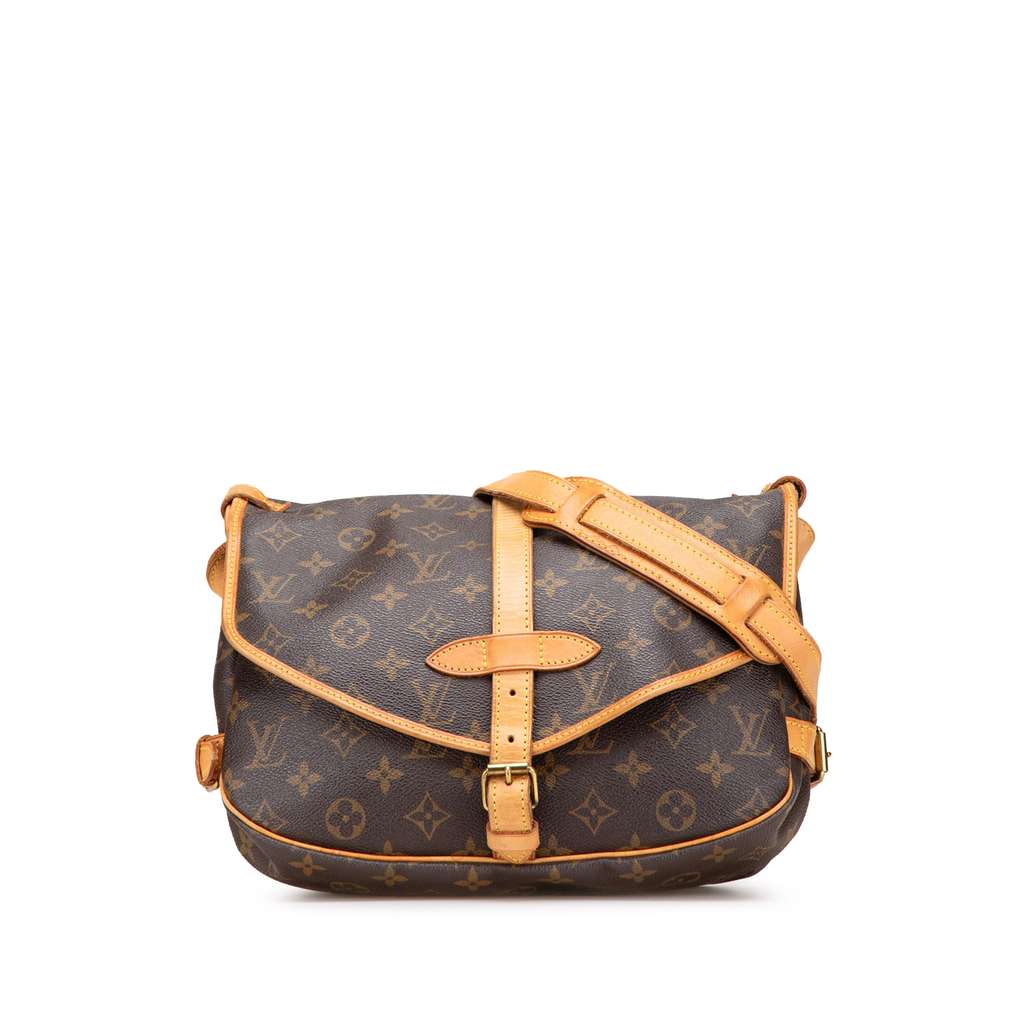 The Saumur 30 features a monogram canvas body with vachetta leather trim, a flat adjustable vachetta leather shoulder strap, double open compartments with front flaps and belt buckle closures.