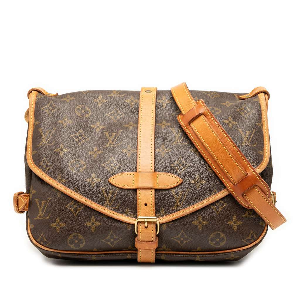 The Saumur 30 features a monogram canvas body with vachetta leather trim, a flat adjustable vachetta leather shoulder strap, double open compartments with front flaps and belt buckle closures, and an interior slip pocket.