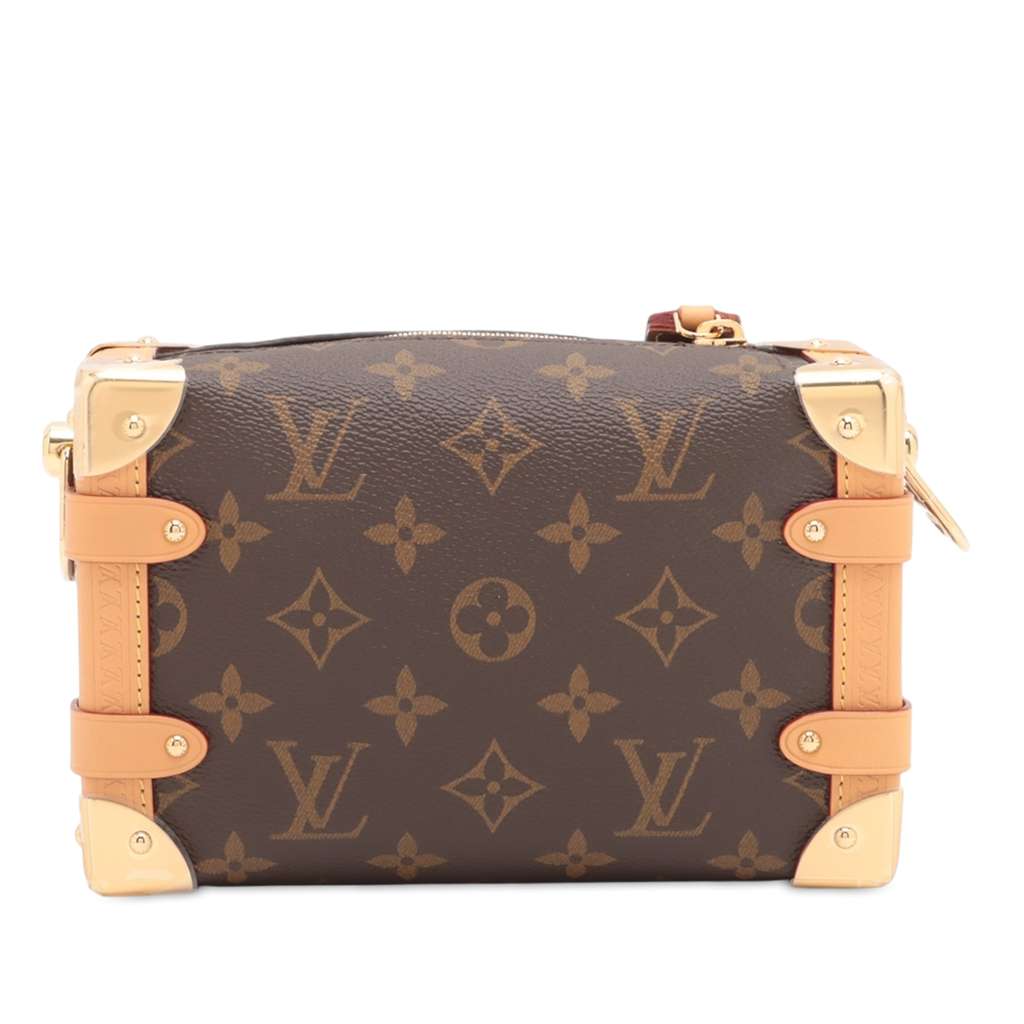 The Side Trunk PM features a monogram canvas body with vachetta leather trim, a detachable vachetta leather handle, an adjustable and detachable vachetta leather strap, and a top zip closure with S-lock zipper pull.