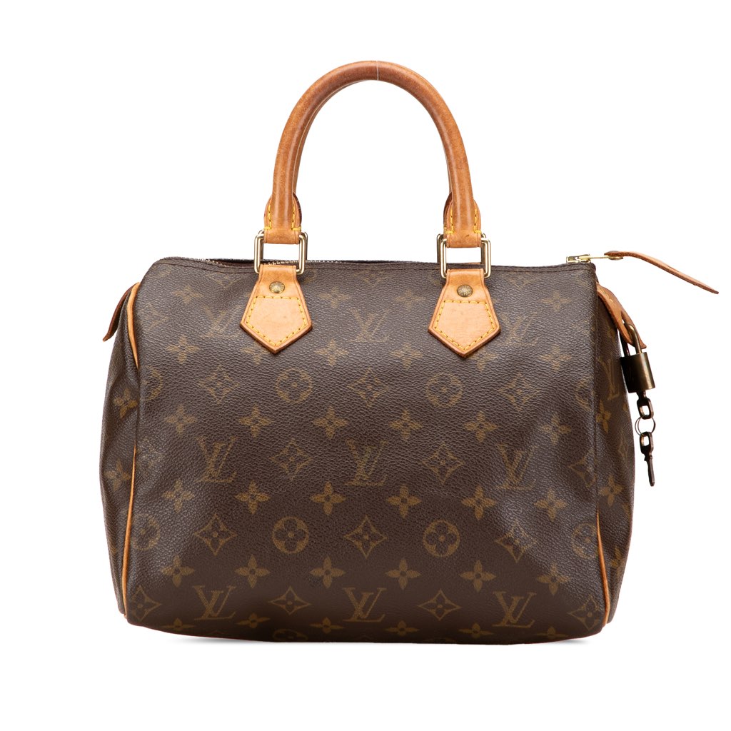 The Speedy 25 features a monogram canvas body with vachetta leather trim, rolled vachetta leather handles, a top zip closure, and an interior slip pocket.