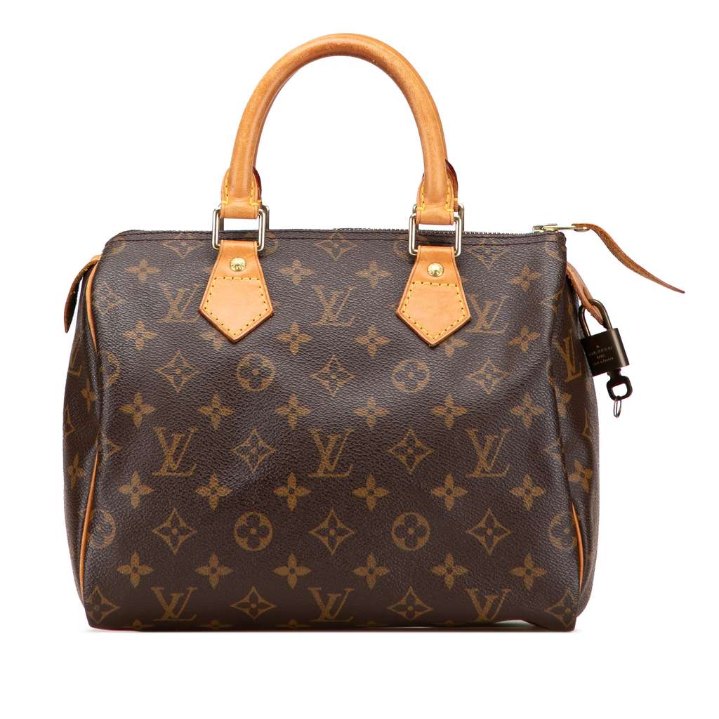 The Speedy 25 features a monogram canvas body, rolled vachetta leather handles, a top zip closure, and an interior slip pocket.