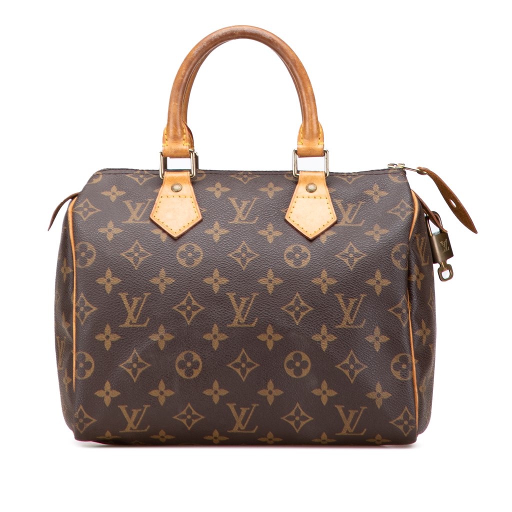 The Speedy 25 features a monogram canvas body, rolled vachetta leather handles, a top zip closure, and an interior slip pocket.