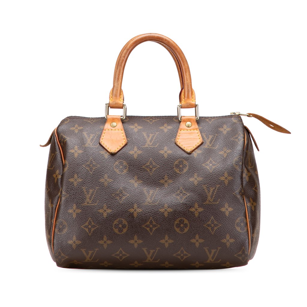 The Speedy 25 features a monogram canvas body with vachetta leather trim, rolled vachetta leather handles, a top zip closure, and an interior slip pocket.