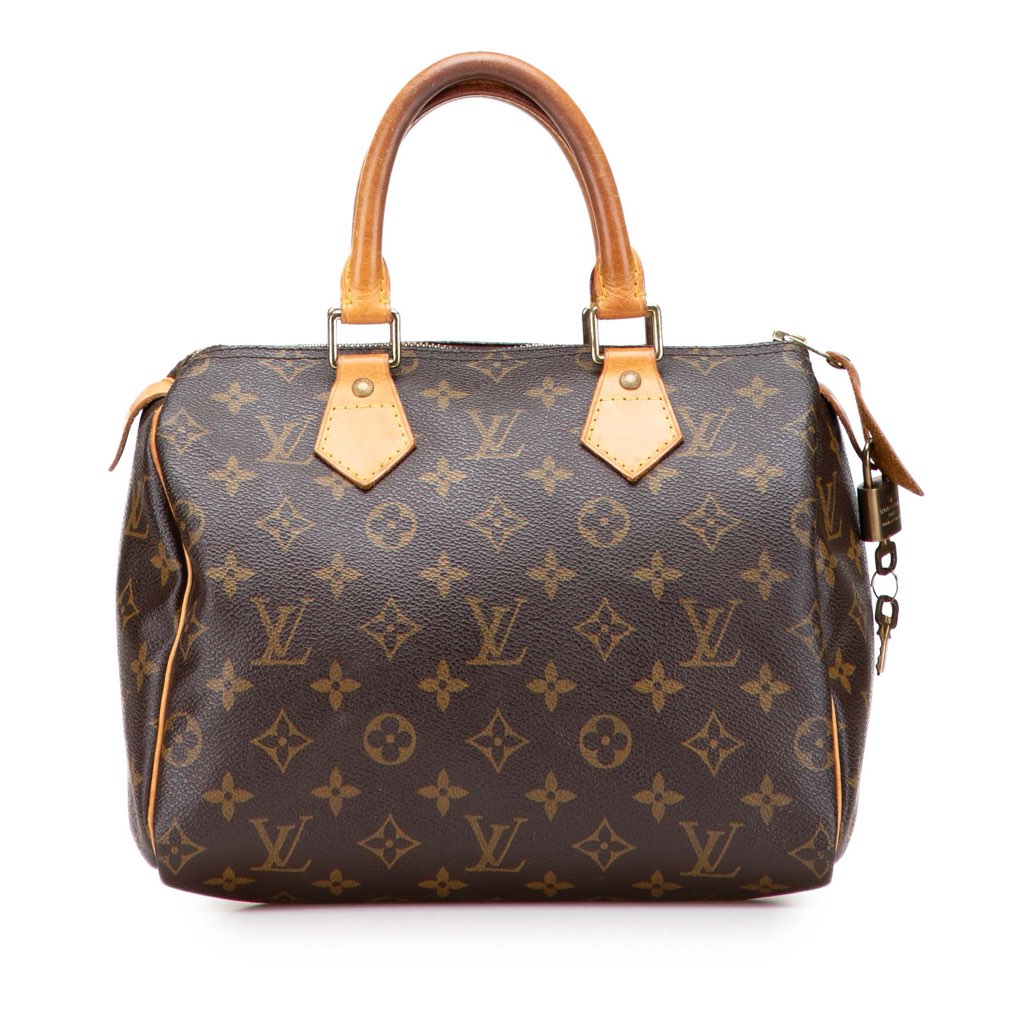 The Speedy 25 features a monogram canvas body with vachetta leather trim, rolled vachetta leather handles, a top zip closure, and an interior slip pocket.