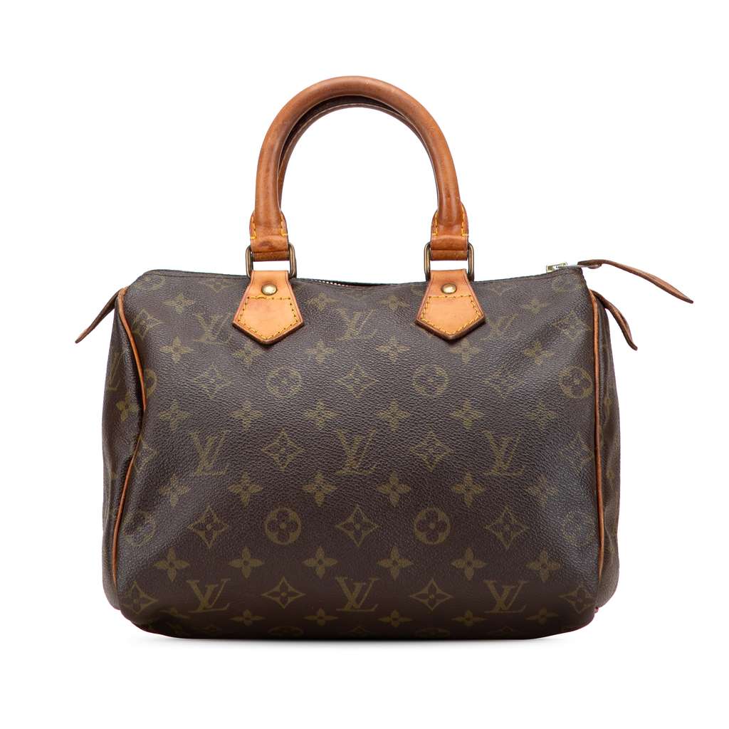 The Speedy 25 features a monogram canvas body, rolled vachetta leather handles, a top zip closure, and an interior slip pocket.