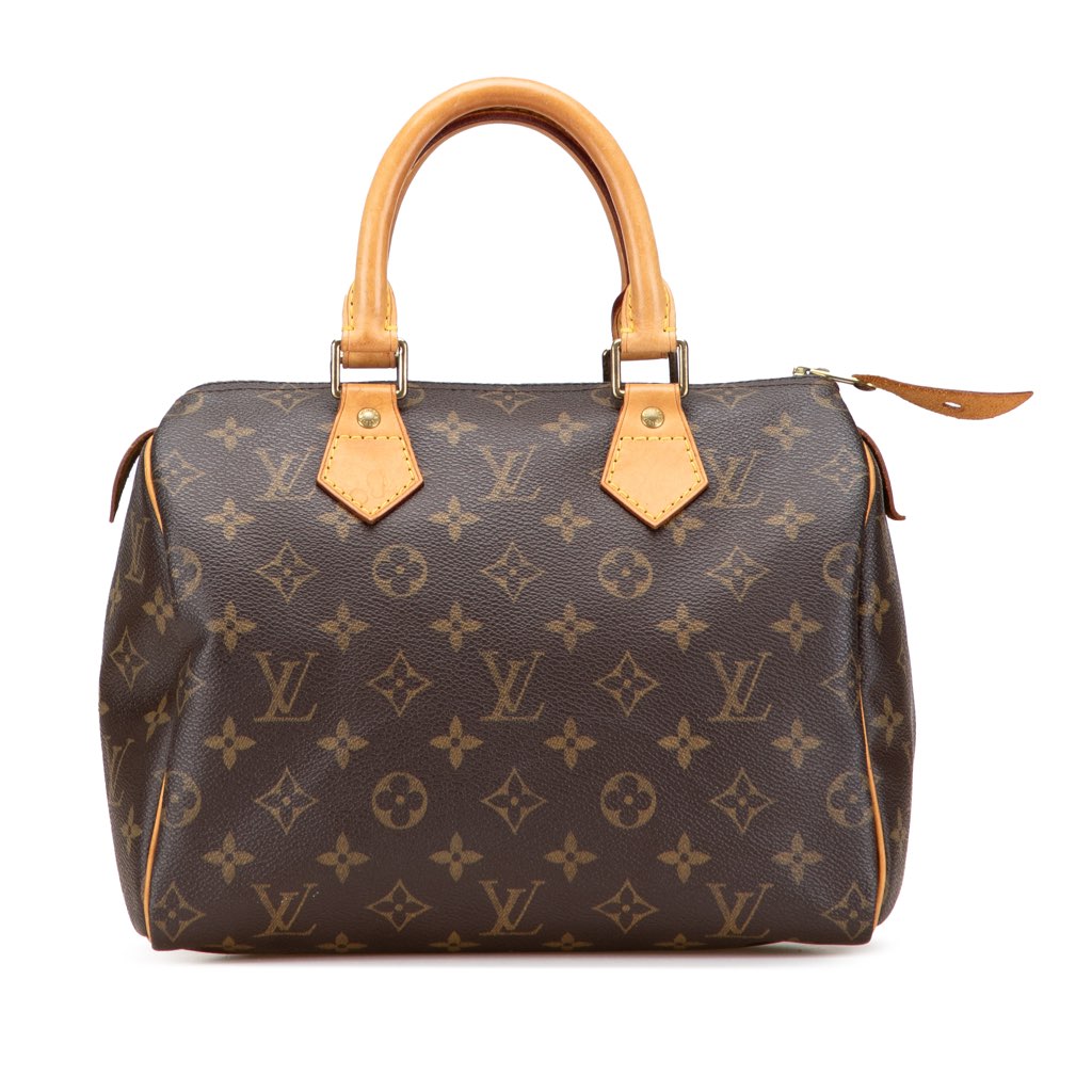 The Speedy 25 features a monogram canvas body with vachetta leather trim, rolled vachetta leather handles, a top zip closure, and an interior slip pocket.
