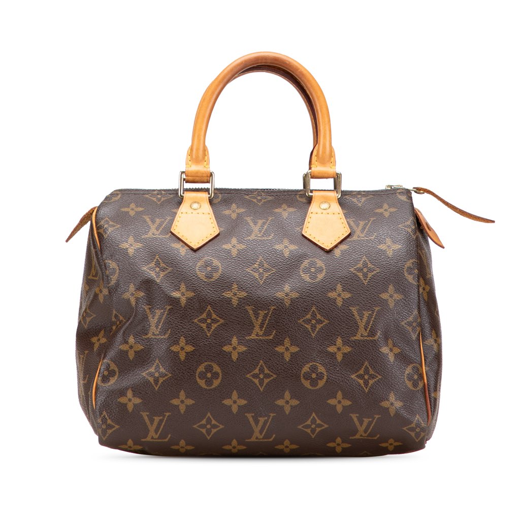 The Speedy 25 features a monogram canvas body, rolled vachetta leather handles, a top zip closure, and an interior slip pocket.