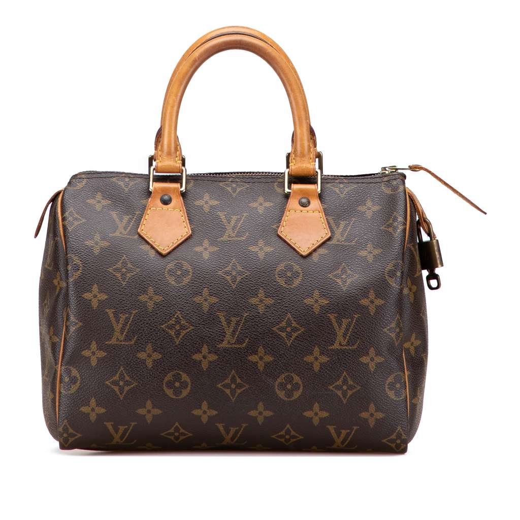 The Speedy 25 features a monogram canvas body with vachetta leather trim, rolled vachetta leather handles, a top zip closure, and an interior slip pocket.