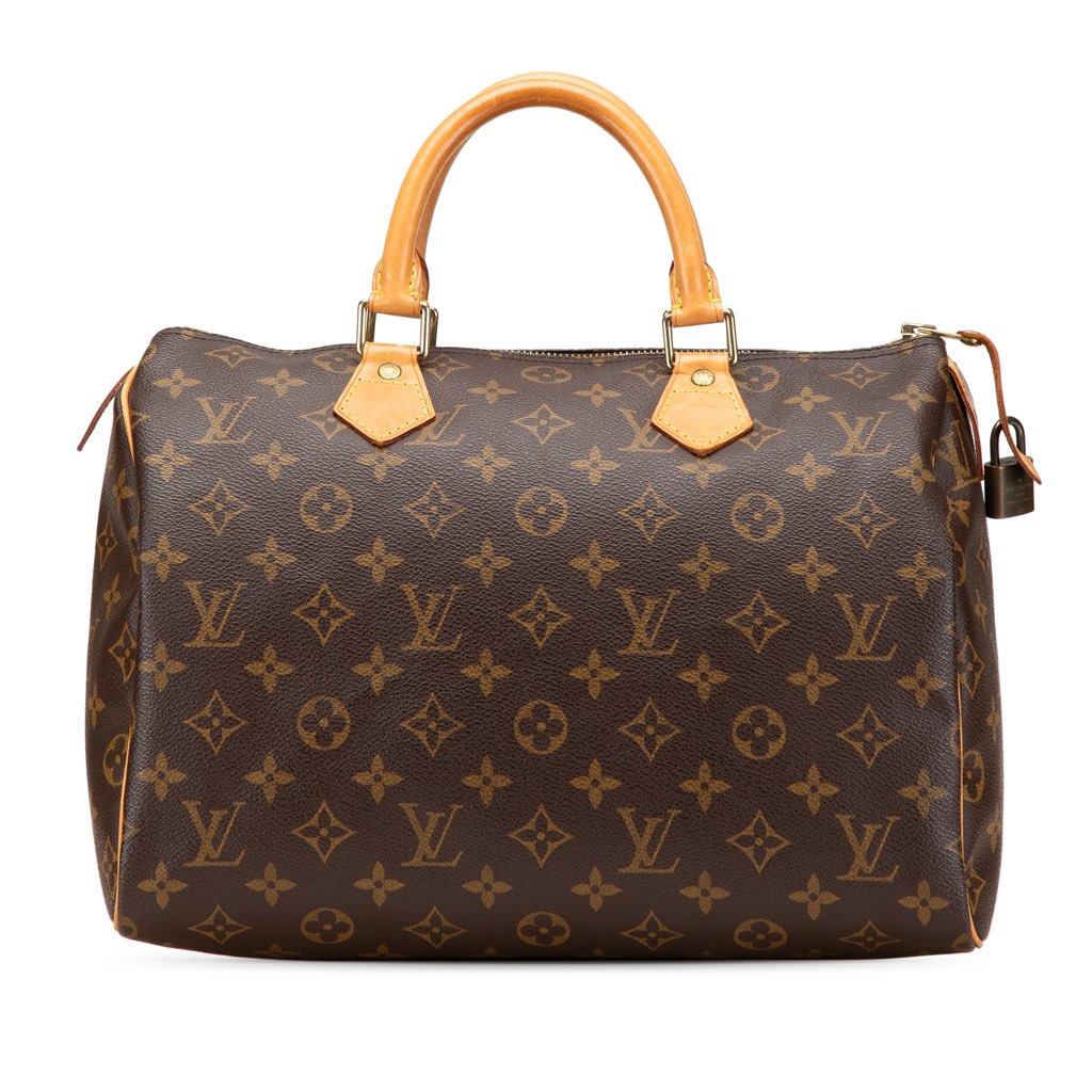 The Speedy 30 features a monogram canvas body with vachetta leather trim, rolled vachetta leather handles, a top zip closure, and an interior pocket.