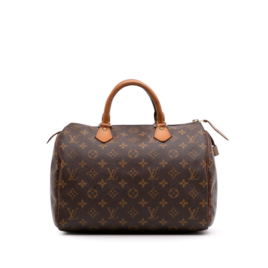 The Speedy 30 features a monogram canvas body with vachetta leather trim, rolled vachetta leather handles, a top zip closure, and an interior slip pocket.