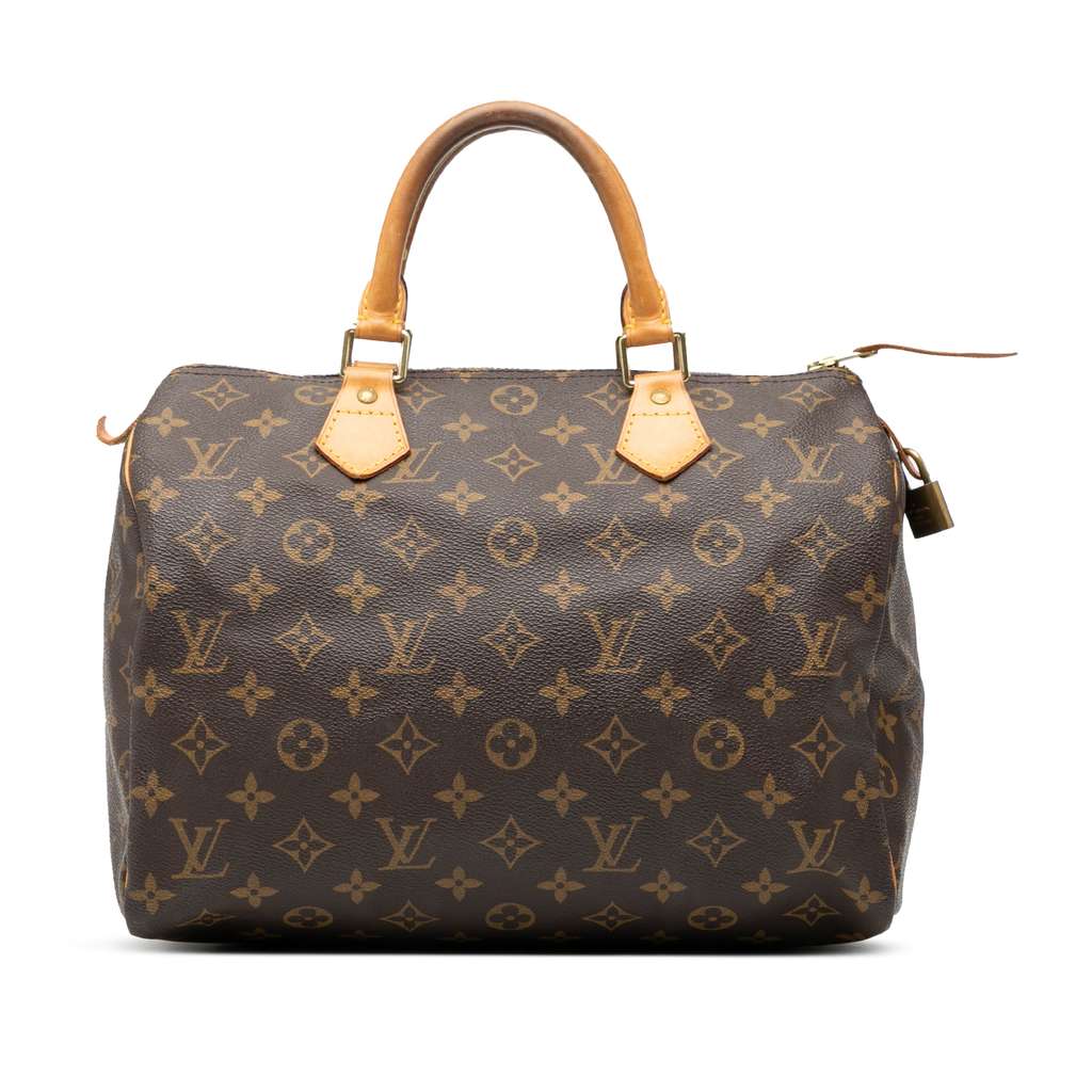 The Speedy 30 features a monogram canvas body with vachetta leather trim, rolled vachetta leather handles, a top zip closure, and an interior slip pocket.