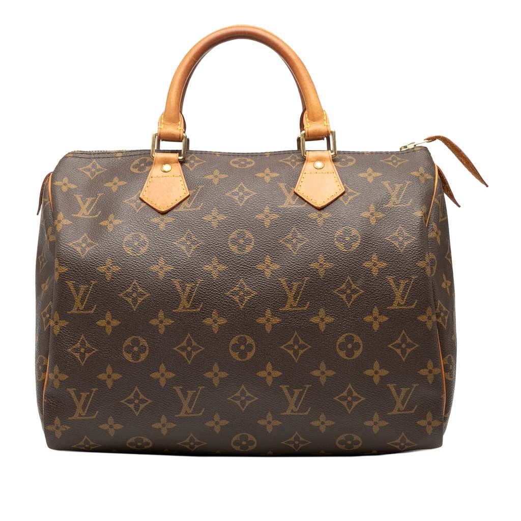 The Speedy 30 features a monogram canvas body, rolled vachetta leather handles, a top zip closure, and an interior pocket.