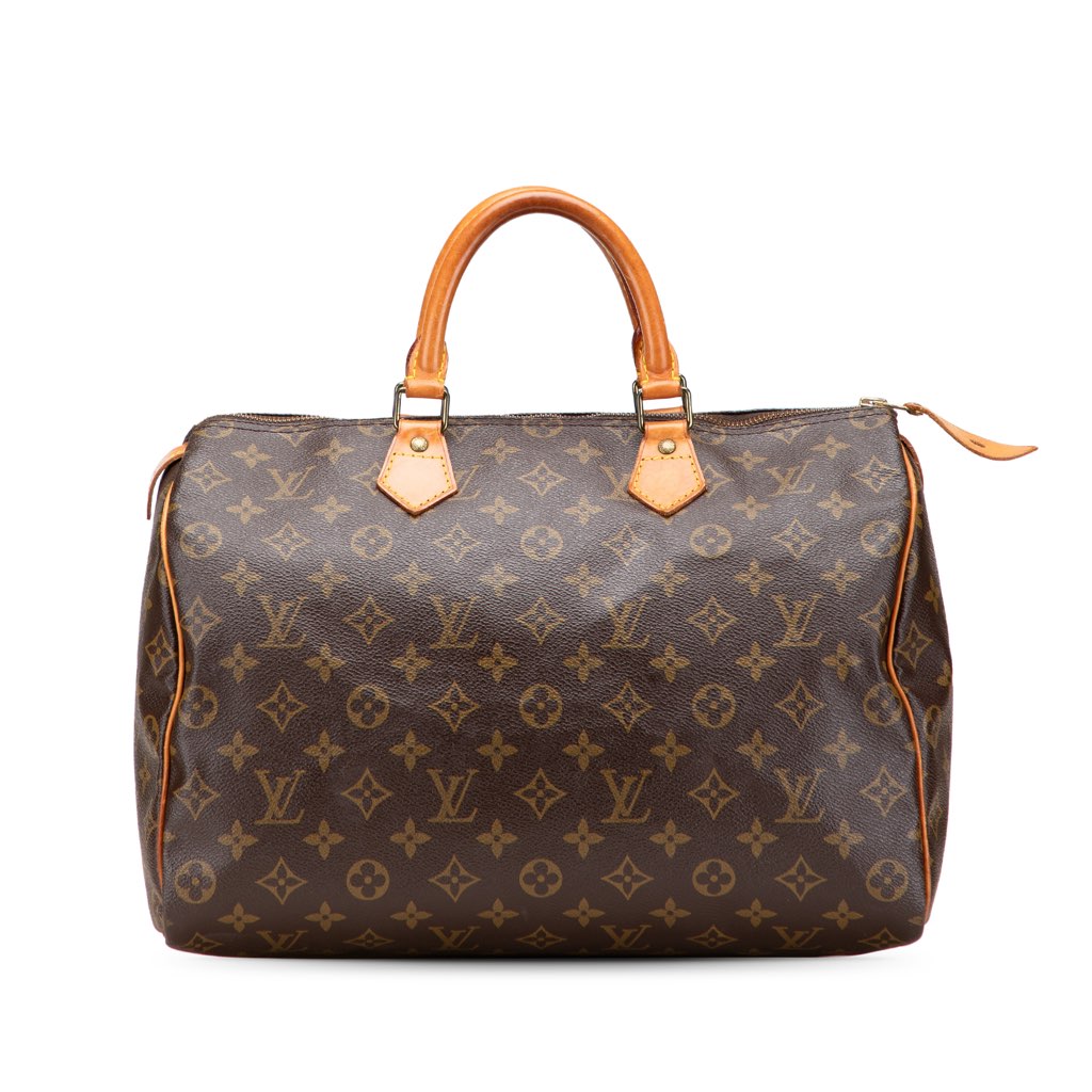The Monogram Speedy 35 features a monogram canvas body with vachetta leather trim, rolled vachetta leather handles, a top zip closure, and an interior slip pocket.