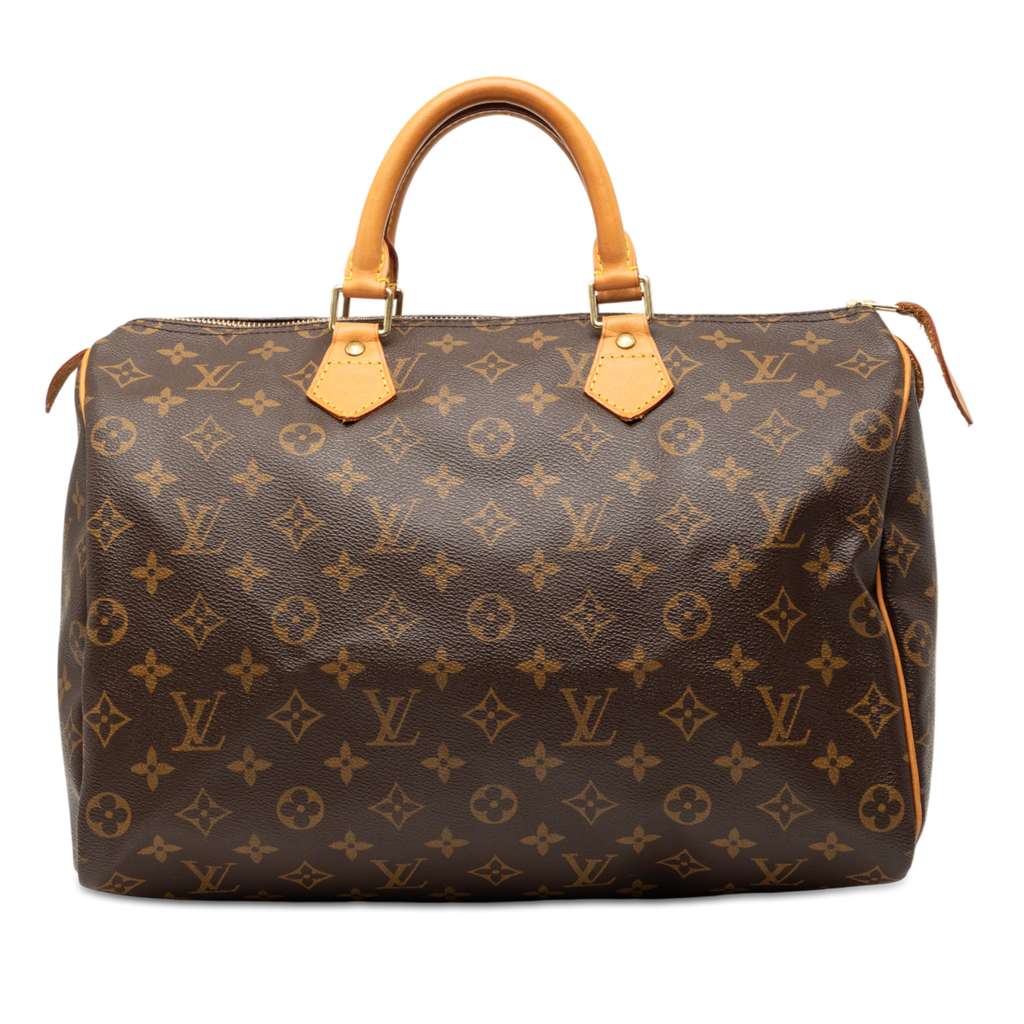 The Speedy 35 features a monogram canvas body, rolled vachetta leather handles, a top zip closure, and an interior slip pocket.
