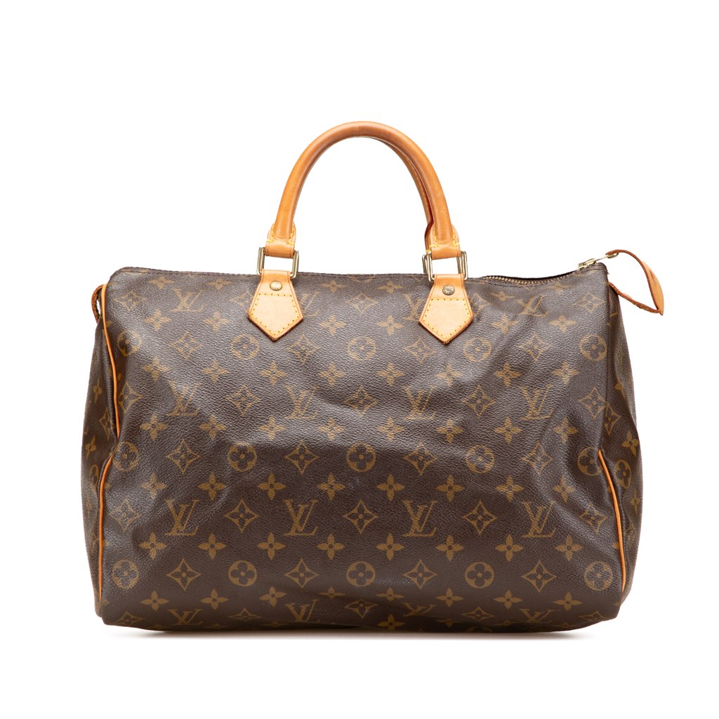 The Speedy 35 features a monogram canvas body with vachetta leather trim, rolled vachetta leather handles, a top zip closure, and an interior slip pocket.