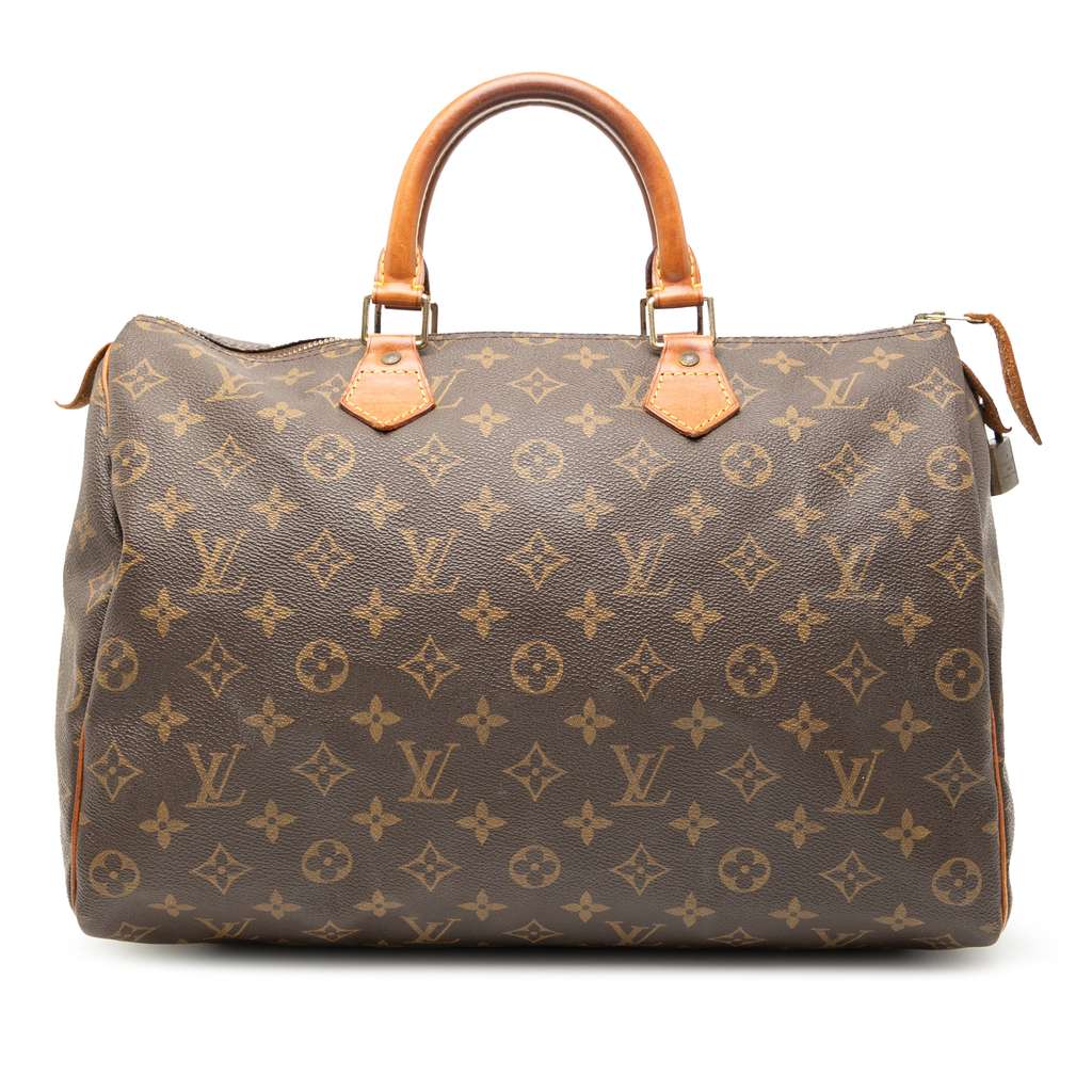 The Speedy 35 features a monogram canvas body with vachetta leather trim, rolled vachetta leather handles, a top zip closure, and an interior slip pocket.