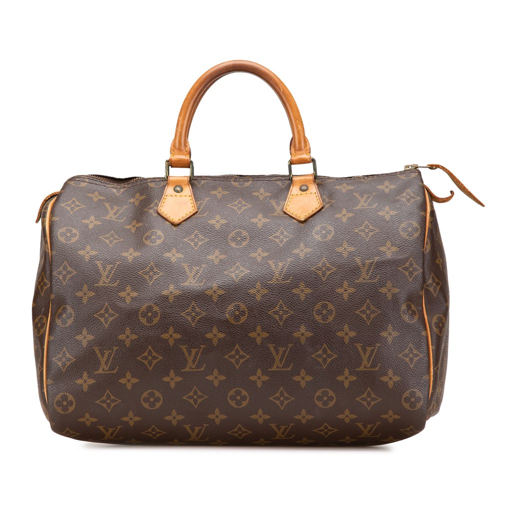 The Speedy 35 features a monogram canvas body, rolled vachetta leather handles, a top zip closure, and an interior slip pocket.