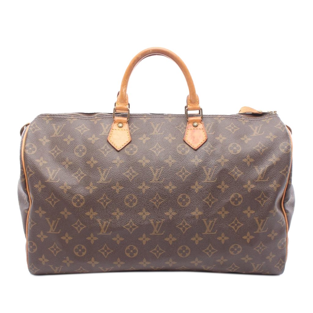 The Speedy 40 features a monogram canvas body, rolled vachetta leather handles, a top zip closure, and an interior slip pocket.