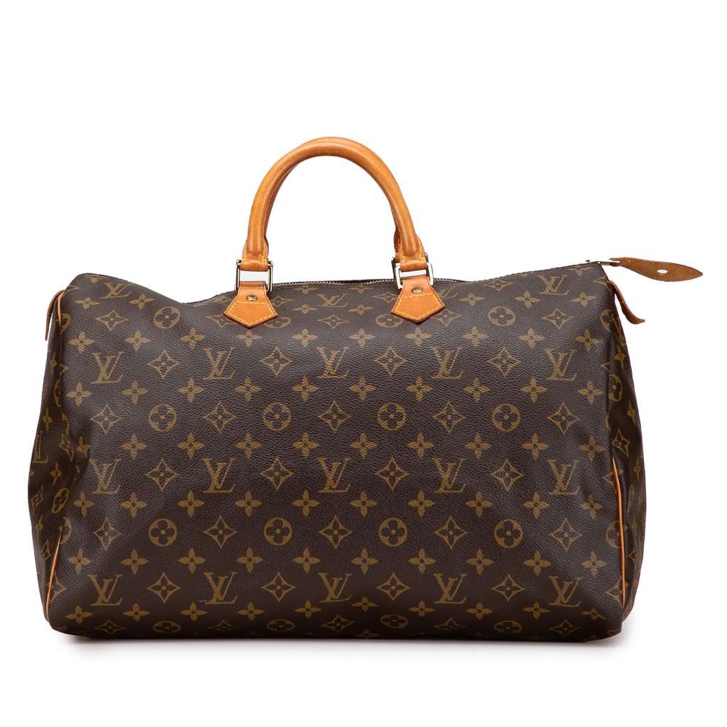 The Speedy 40 features a monogram canvas body, rolled vachetta leather handles, and a top zip closure.