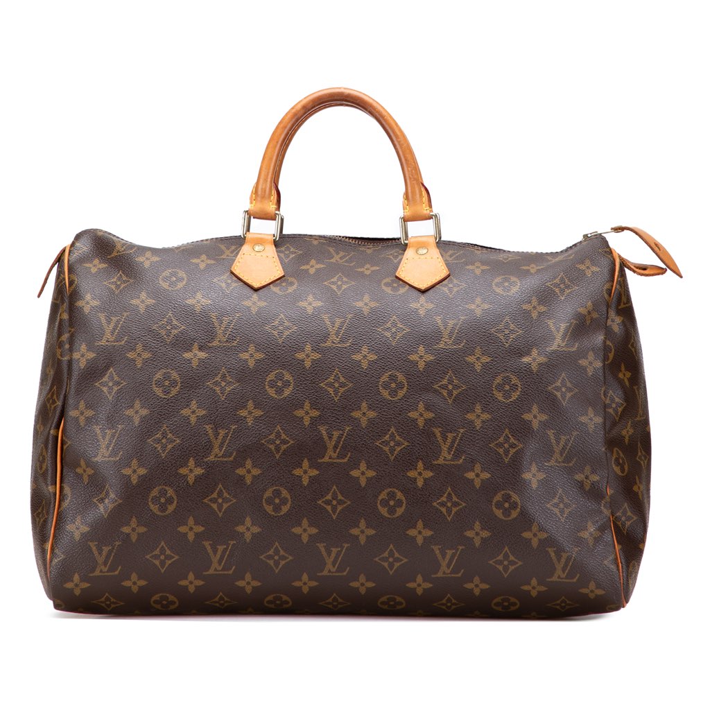 The Speedy 40 features a monogram canvas body, rolled vachetta leather handles, and a top zip closure.