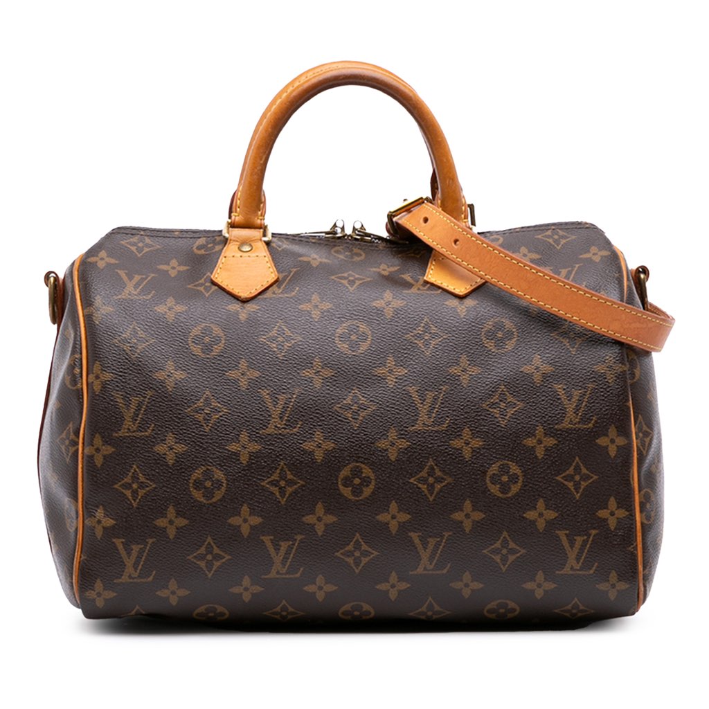 The Speedy Bandouliere 30 features a monogram canvas body with vachetta leather trim, rolled vachetta leather handles, a detachable flat vachetta leather strap, and top zip closures.