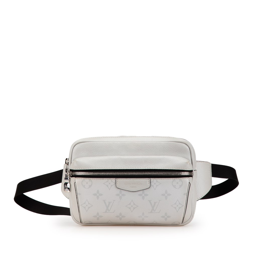 This belt bag features a monogram canvas and taiga leather body, an adjustable waist strap, a top zip closure, and an exterior front zip pocket.